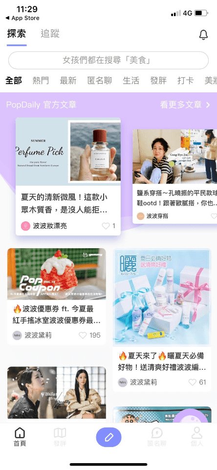 波波黛莉(PopDaily)是一個以女性為主的社群平台,可以讓使用者發布文章、撰寫文章、打卡並分享各種生活上的事情。在這個案子裡,我主要協助開發與優化新版首頁、新版美食地圖與創作者後台,整體APP架構優化等